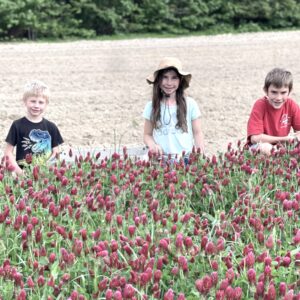 Our youngest farmers are harvesting clover for clover tea.
